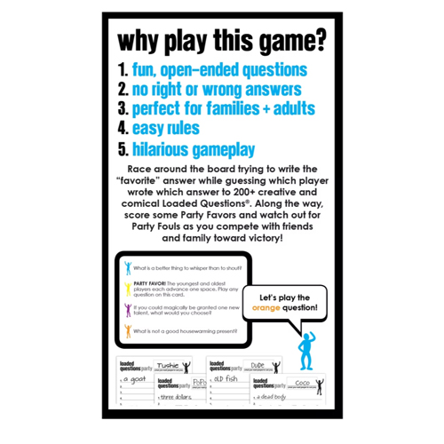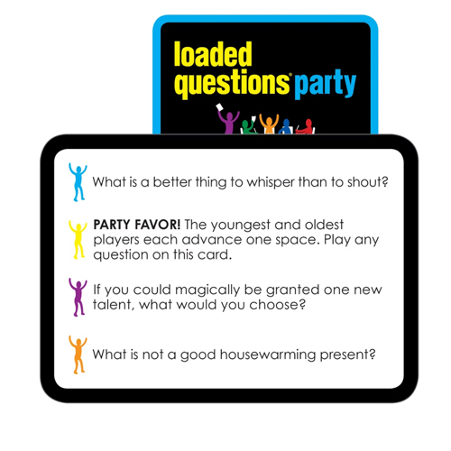 Friends. Family. Random Strangers. It’s Party Time! Race around the board trying to write the "favorite" answer while guessing which player wrote which answer to 200+ creative and comical Loaded Questions. Along the way, score some Party Favors and watch out for Party Fouls as you compete with friends and family towards victory! Loaded Questions Party is your answer to an epic and memorable game night!