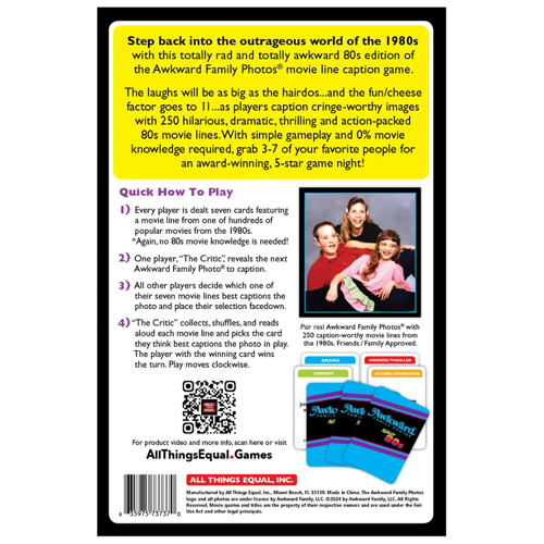 Step back into the outrageous world of the 1980s with this totally rad and totally awkward 80s edition of the Awkward Family Photos movie line caption game. The laughs will be as big as the hairdos...and the fun / cheese factor goes to 11...as players caption cringe-worthy images with 250 hilarious, dramatic, thrilling and action-packed 80s movie lines. With simple gameplay and 0% movie knowledge required, grab 3-7 of your favorite people for an award-winning, 5-star game night!