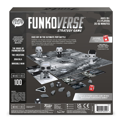 Move through memorable locations — Dracula’s Castle or Frankenstein’s Laboratory — and use your characters’ unique abilities to capture points and achieve victory! In the Funkoverse Strategy Game, you combine your favorite characters and go head-to-head in exciting game scenarios. Each turn, you select one of your characters and perform two actions. Each character has access to basic actions like moving and challenges as well as several unique abilities that may be performed only by spending ability tokens. Funkoverse uses an innovative “cooldown” system — the more powerful the ability, the longer it will take for the ability token to become available again — so players have to spend their ability tokens wisely. Each character in Funkoverse is unique, so players are encouraged to try out different combinations of characters and items in order to discover their favorite synergies and powerful strategies for the different game scenario. Funkoverse Strategy Game: Universal Monsters 100 4-Pack. Assemble the Bride of Frankenstein from robbed graves to unleash her undead prowess! Use Dracula’s blood-draining abilities to power up your attacks and terrorize your foes! Ambush and abduct your rivals with the Creature From the Black Lagoon! Four different gameplay scenarios give four different ways to play the game!