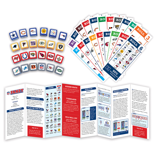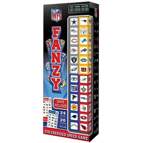 Face off in this NFL Fanzy speed dice game featuring all 32 NFL Teams. Be the first to call out “Fanzy” and win cards in this fast-paced family game thriller. This game can be played with 2-4 players and is good for ages 6+.