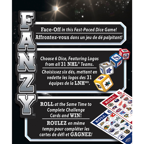Face off in this NFL Fanzy speed dice game featuring all 31 NHL Teams. Be the first to call out “Fanzy” and win cards in this fast-paced family game thriller. This game can be played with 2-4 players and is good for ages 6+.