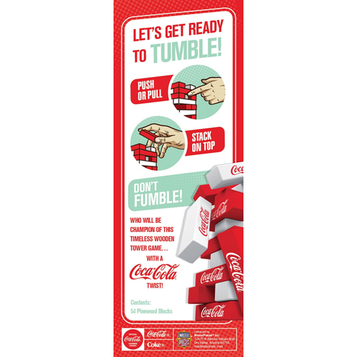 Enjoy this classic wooden Coca-Cola Tumble Tower game featuring 54 Coca-Cola themed wooden blocks. Be the last player to stack a block without causing the tower to tumble… the higher the tower grows, the harder the challenge! For 1+ players.