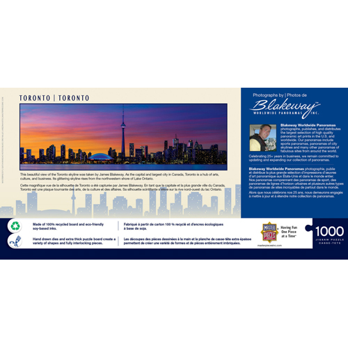 This MasterPieces 1000pc 13" x 39" panorama of the beautiful Toronto skyline was taken by James Blakeway. As the capital and largest city in Canada, Toronto is a hub of arts, culture, and business. Its glittering skyline rises from the northwestern shore of Lake Ontario.