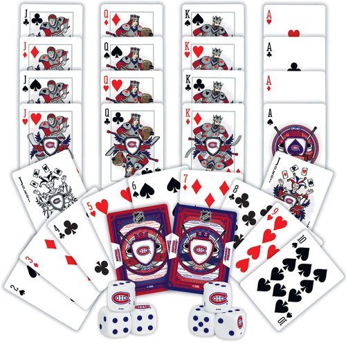 Two decks of playing cards and six team dice. Face cards feature custom Montreal Canadiens designs.